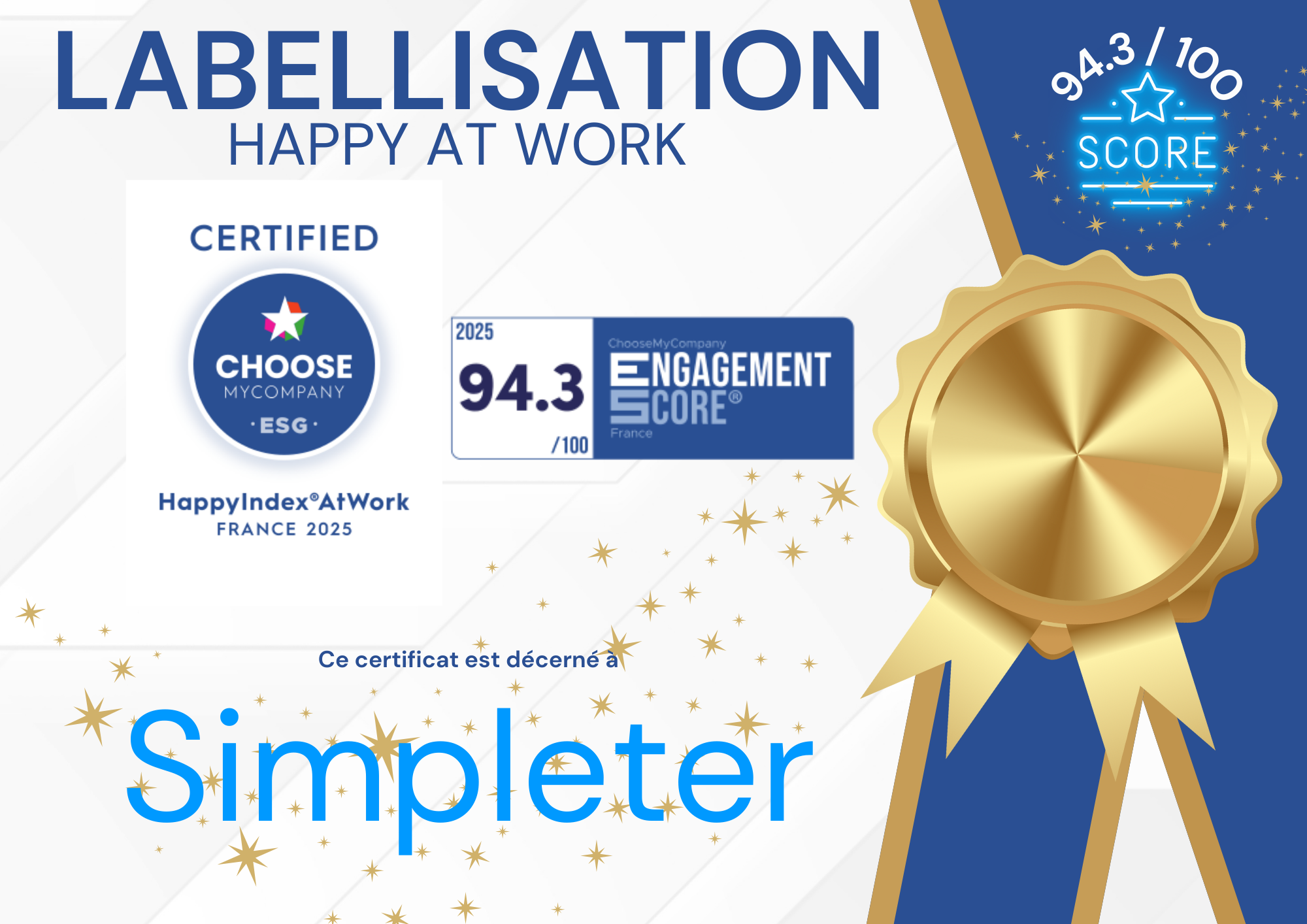 Nous sommes fiers d’annoncer que Simpleter a obtenu le prestigieux label Happy At Work avec une note remarquable de 94,3/100 !